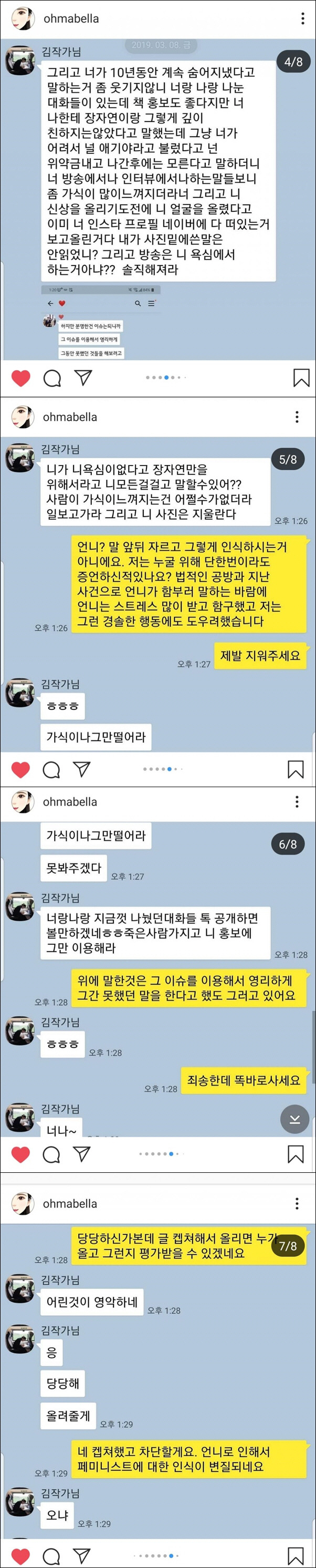 김수민 작가는 16일 자신의 SNS에 ‘작가 김수민입니다. 윤지오씨 말은 100% 진실일까요’라는 제목으로 윤지오가 고 장자연 사건과 관련해 순수하지 않은 의도를 갖고 있다고 폭로하는 게시물을 게재했다. 해당 내용에 따르면 김수민 작가는 “죽은 사람 가지고 네 홍보에 그만 이용하라”고 지적했고, 윤지오는 “죄송한데 똑바로 사세요”라고 답했다.
