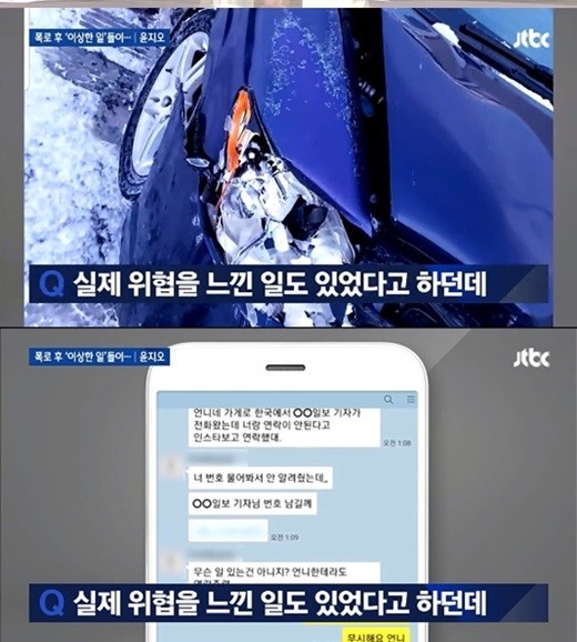 하지만 23일 엑스포츠뉴스는 한 제보자에 의해 입수한 윤지오와 김수민 작가가 나눈 SNS 대화 메시지를 공개했는데, 이에 따르면 앞 범퍼가 찌그러져 있는 파란색의 차량은 윤지오 차가 아니라 윤지오와 단순 추돌 사고가 난 가해자의 차량이었다. 이에 엑스포츠뉴스는 윤지오가 위협을 받아 피해를 입었다는 거짓말에 임팩트를 주기 위해 자신의 차량이 아닌 파손이 더 심한 가해자 차량을 방송에 내보낸 것 같다는 제보자의 의견도 설명했다.
