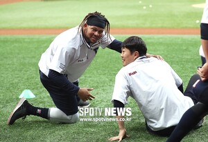 [스포티비뉴스=고척, 곽혜미 기자] 2019 신한은행 MY CAR KBO리그 키움 히어로즈와 두산 베어스의 경기가 23일 오후 서울 구로구 고척스카이돔에서 열린다. 두산 페르난데스가 류지혁에게 사진 촬영을 권유하고 있다.