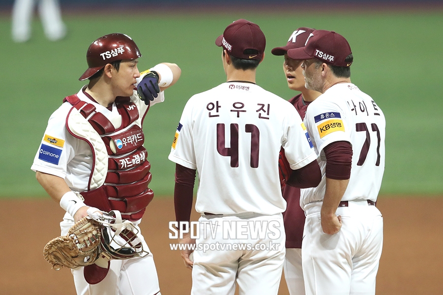 [스포티비뉴스=고척, 곽혜미 기자] 2019 신한은행 MY CAR KBO리그 키움 히어로즈와 두산 베어스의 경기가 23일 오후 서울 구로구 고척스카이돔에서 열렸다. 4회초 무사 만루 상황에서 키움 안우진이 나이트 코치와 대화를 나누고 있다.