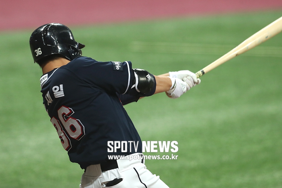 [스포티비뉴스=고척, 곽혜미 기자] 2019 신한은행 MY CAR KBO리그 키움 히어로즈와 두산 베어스의 경기가 23일 오후 서울 구로구 고척스카이돔에서 열렸다. 4회초 무사 만루 상황에서 두산 오재일이 역전 2타점 적시타를 치고 있다.