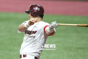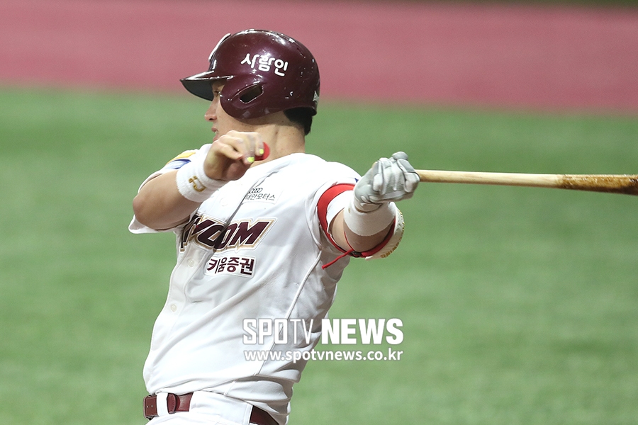 [스포티비뉴스=고척, 곽혜미 기자] 2019 신한은행 MY CAR KBO리그 키움 히어로즈와 두산 베어스의 경기가 23일 오후 서울 구로구 고척스카이돔에서 열렸다. 7회말 1사 키움 박동원이 안타를 날리고 있다.