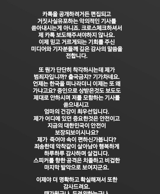 그러면서 "엄마의 건강이 최우선이다. 제가 어디에 있든 중요한 것은 안전이다. 지금의 대한민국이 안전이 보장돼 보이시냐. 제가 죽어야 속이 편하신가 보다. 죄송한데 악착같이 살아남아 행복하게 하루하루 감사하며 살 겁니다. 스피커를 향한 공격은 치졸하고 비겁한 마지막 발악으로 보인다"고 밝혔다.