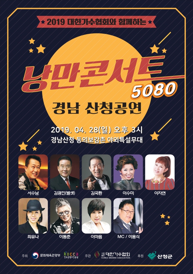 문화체육관광부 한국콘텐츠진흥원 주최, (사)대한가수협회(회장 이자연)와 경남 산청군 후원 2019 첫 낭만콘서트는 '찰랑 찰랑'의 이자연, '흔적'의 최유나, '타타타'의 김국환, '과수원길'의 서수남. '전우'의 별셋 김광진, '봉자야'의 배우 겸 가수 이동준, '여고시절'의 이수미, '천년 만년'의 이마음 등이 출연한다. 코미디언 이용식이 가수협회 낭만콘서트에서 처음 MC를 맡아 행사를 진행한다.