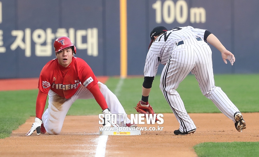 [스포티비뉴스=잠실, 한희재 기자] LG 트윈스와 KIA 타이거즈의 2019 KBO리그 경기가 24일 오후 서울 잠실야구장에서 열렸다. 1회초 1사 2루, KIA 김주찬이 헛스윙 삼진 당하는 사이 2루주자 이창진이 3루 도루에 성공해 베이스를 터치하고 있다.