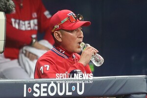 [스포티비뉴스=고척, 곽혜미 기자] 2019 신한은행 MY CAR KBO리그 키움 히어로즈와 KIA 타이거즈의 경기가 26일 오후 서울 구로구 고척스카이돔에서 열렸다. 2-8로 뒤진 5회말 KIA 김기태 감독이 물을 마시고 있다.