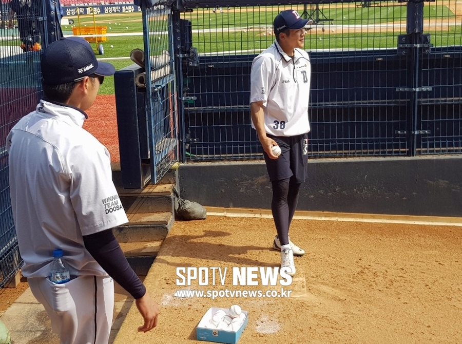 김 코치는 나름대로 스트레스를 받고 있을 김대한이 오랜만에 공을 던지면서 기분을 바꿀 기회를 줬다. 포수 이흥련이 김대한의 공을 받아줬고, 정재훈 불펜 코치와 권명철 수석 코치도 옆에서 흥미롭게 지켜봤다.