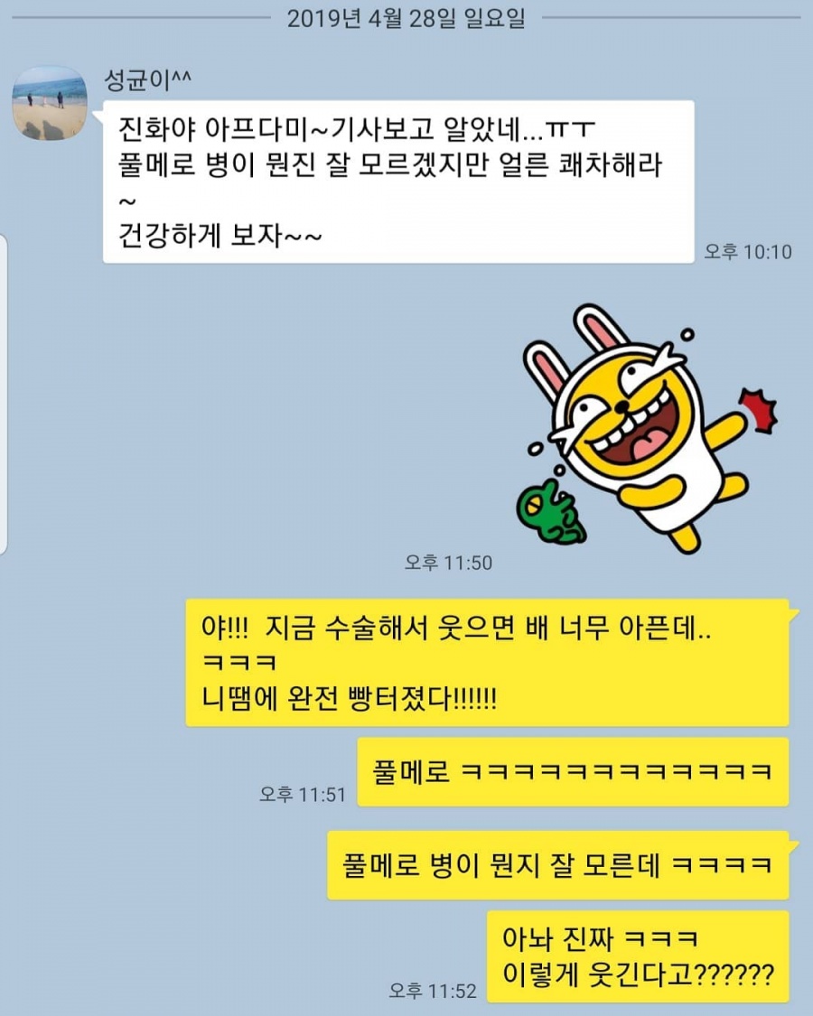 이에 이를 접한 심진화의 지인 김성균이 "진화야 아프다며? 기사 보고 알았다. ㅠㅠ 풀메로 병이 뭔진 잘 모르지만 얼른 쾌차해라. 건강하게 보자"라는 문자를 보냈다.