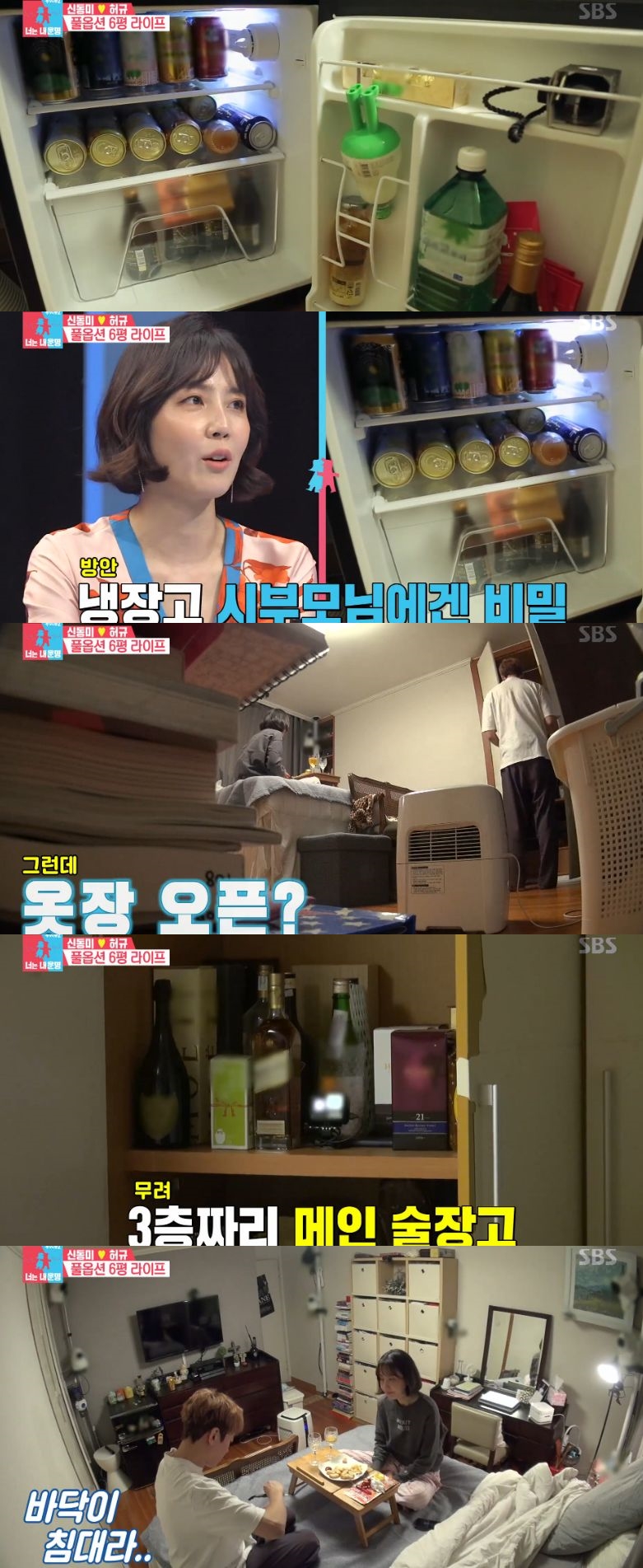 이들은 시부모님이 깨실까봐 몰래 술상을 마련했고 거실로 나갈 때는 손전등을 챙겨 나갔다. 신동미는 "사실 방 안에 냉장고가 있는 것은 절대 모른다"라며 뿌듯하게 술만 가득히 들어있는 냉장고를 열었다.