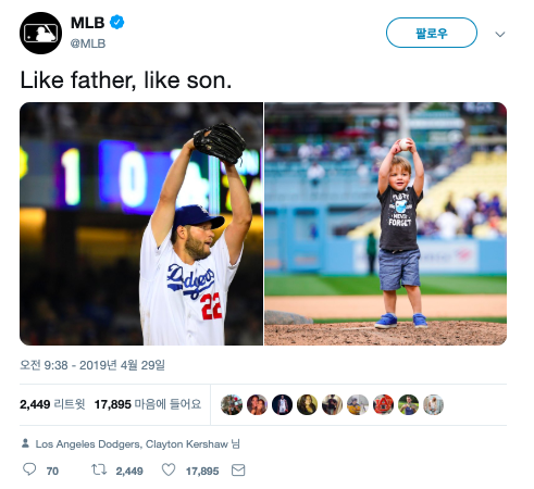 최근 메이저리그에서는 페르난도 타티스 주니어, 블라디미르 게레로 주니어와 같이 야구인 2세들이 주목받고 있다. 'CUT4'는 이들의 이름을 언급하며 "커쇼의 아들은 아직 실력이 부족했지만 귀염성으로 커버할 수 있었다"고 재치있게 전했다.