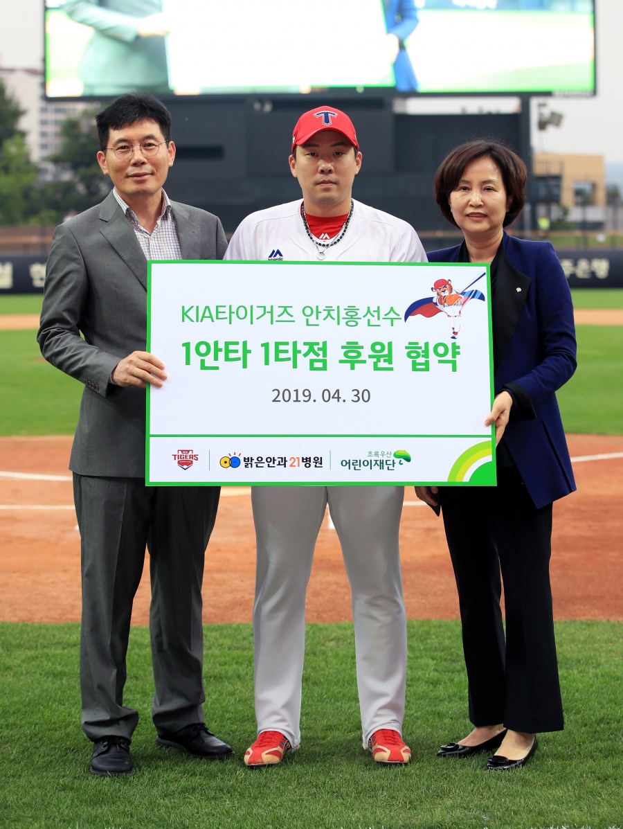 안치홍은 30일 광주 삼성전에 앞서 초록우산 어린이재단 광주지역본부 김은영 본부장과 밝은안과21병원 윤길중 원장이 참석한 가운데 ‘야구 꿈나무 양성 1안타 1타점 후원 협약식’을 갖고 올 시즌 1안타 및 1타점당 각각 2만원을 적립해 시즌 종료 후 어린이재단에 기부할 예정이다.