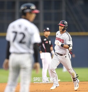 [스포티비뉴스=서울, 곽혜미 기자] 2019 신한은행 MY CAR KBO리그 LG 트윈스와 KT 위즈의 경기가 30일 오후 서울 잠실야구장에서 열렸다. 1회말 1사 LG 정주현이 솔로포를 날린 후 그라운드를 돌고 있다.