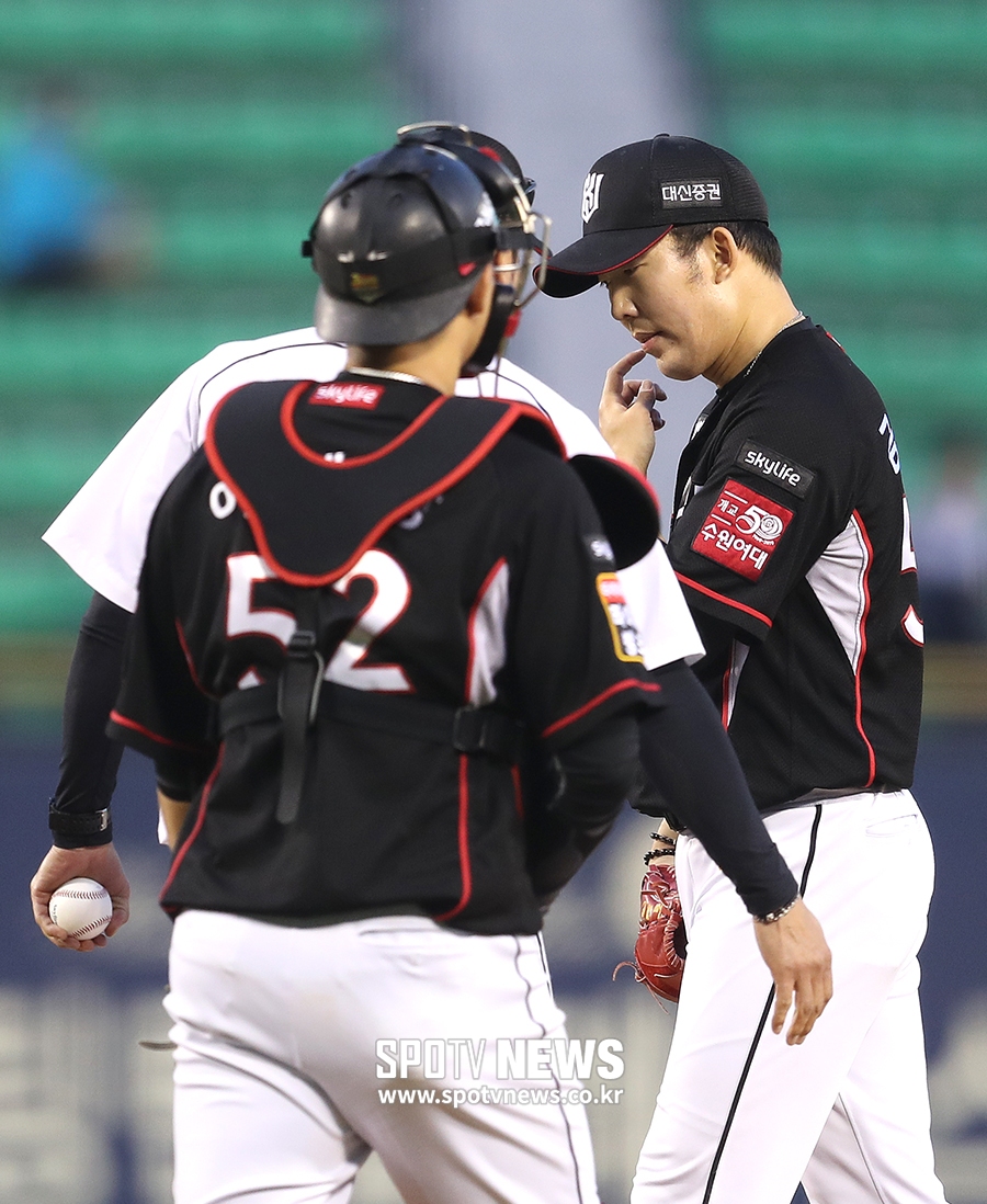 [스포티비뉴스=서울, 곽혜미 기자] 2019 신한은행 MY CAR KBO리그 LG 트윈스와 KT 위즈의 경기가 30일 오후 서울 잠실야구장에서 열렸다. 2회말 무사 1,3루 상황에서 KT 금민철이 강판되고 있다.