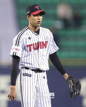 [스포티비뉴스=서울, 곽혜미 기자] 2019 신한은행 MY CAR KBO리그 LG 트윈스와 KT 위즈의 경기가 30일 오후 서울 잠실야구장에서 열렸다. 6회초 구원등판해 만루 위기를 넘긴 LG 정우영이 이닝 종료 후 더그아웃으로 향하고 있다.