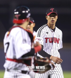 [스포티비뉴스=서울, 곽혜미 기자] 2019 신한은행 MY CAR KBO리그 LG 트윈스와 KT 위즈의 경기가 30일 오후 서울 잠실야구장에서 열렸다. 6회초 구원등판해 만루 위기를 넘긴 LG 정우영이 이닝 종료 후 더그아웃으로 향하며 유강남을 바라보고 있다.