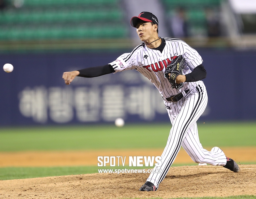 [스포티비뉴스=서울, 곽혜미 기자] 2019 신한은행 MY CAR KBO리그 LG 트윈스와 KT 위즈의 경기가 30일 오후 서울 잠실야구장에서 열렸다. 7회초 LG 정우영이 역투하고 있다.