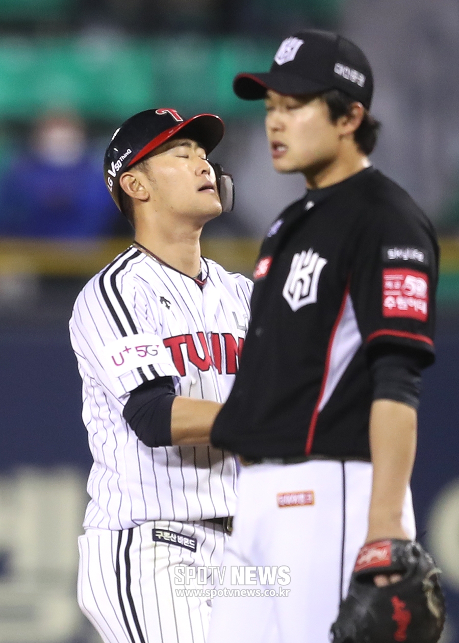 [스포티비뉴스=서울, 곽혜미 기자] 2019 신한은행 MY CAR KBO리그 LG 트윈스와 KT 위즈의 경기가 30일 오후 서울 잠실야구장에서 열렸다. 연장 10회말 1사 1,3루 상황에서 LG 정주현이 동점 적시타를 날린 후 안도의 한숨을 내쉬고 있다.