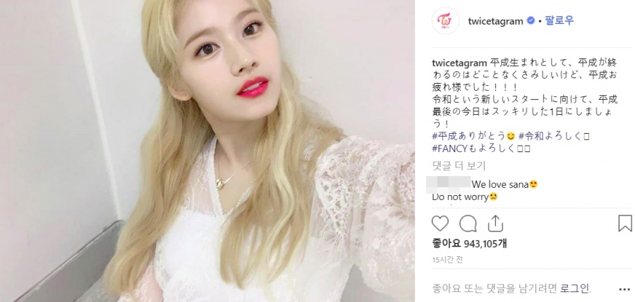 사나는 지난달 30일 트와이스 공식 SNS에 "헤이세이 시대에 태어난 사람으로서 헤이세이가 끝난다는 건 어딘지 쓸쓸하지만 헤이세이 수고했다"며 "레이와라는 새로운 시작을 위해 헤이세이의 마지막인 오늘을 깔끔한 하루로 만들자. 헤이세이 고맙다"라고 일본어로 글을 남겼다.