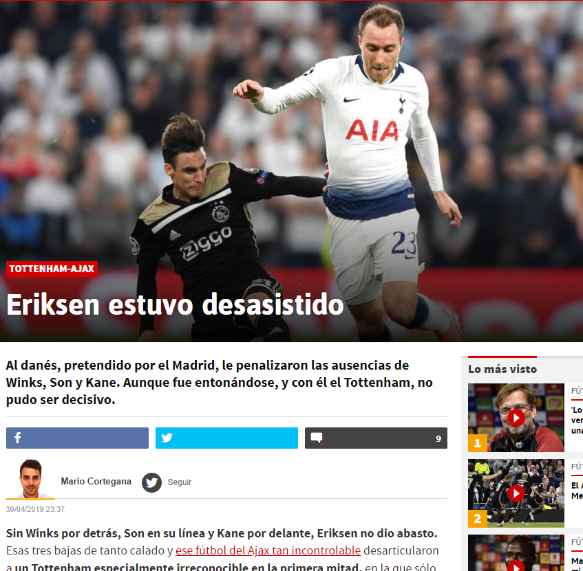 스페인 스포츠 신문 아스는 4월 30일 인터넷판 뉴스를 통해 "에릭센이 도움이 되지 못했다"고 썼다. 손흥민을 비롯한 토트넘 주력 선수들의 결장 속을 에릭센이 극복하지 못했다는 분석이다.