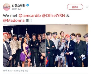 2일 방탄소년단은 공식 트위터에 팝의 전설 마돈나와 래퍼 카디비와 함께 찍은 사진을 게재했다. 이들은 모두 미국 라스베이거스 MGM 그랜드 가든 아레나에서 열린 2019 빌보드 뮤직 어워드에 참석했다. 모두 활짝 웃으면서 카메라를 향해 함께 포즈를 취는 모습이 빌보드 뮤직어워드를 즐기는 것으로 보인다.