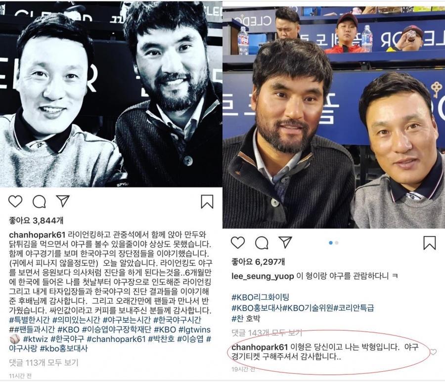 다른 한편에서는 이승엽이 이날 자신의 인스타그램에 박찬호와 함께 찍은 사진을 게재했다. 이승엽은 박찬호의 장문과는 달리 "이 형이랑 야구를 관람하다니"라고 짧은 글을 남겼다. 그런데 이승엽의 게시물에 박찬호가 “이 형은 당신이고 나는 ‘박형’입니다. 야구 경기 티켓 구해주셔서 감사합니다”고 ‘아재 개그’로 받아치는 댓글을 달아 한 번 더 웃음을 안겼다.
