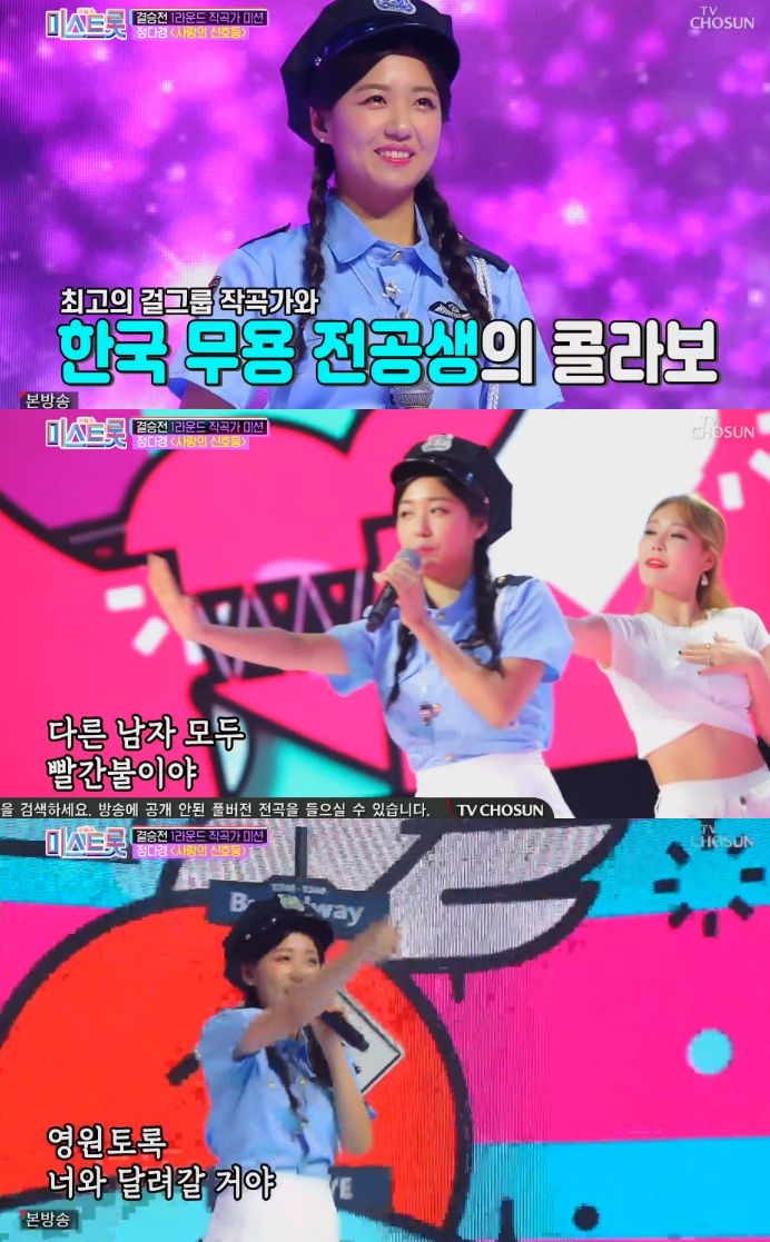 예선 5위로 미스트롯 후보인 정다경은 첫번째로 무대에 올랐다. 1라운드 작곡가 미션으로 이단옆차기의 도움을 받은 '사랑의 신호등'을 부르게 된 정다경은 경찰 유니폼을 입고 등장해 눈길을 끌었다.