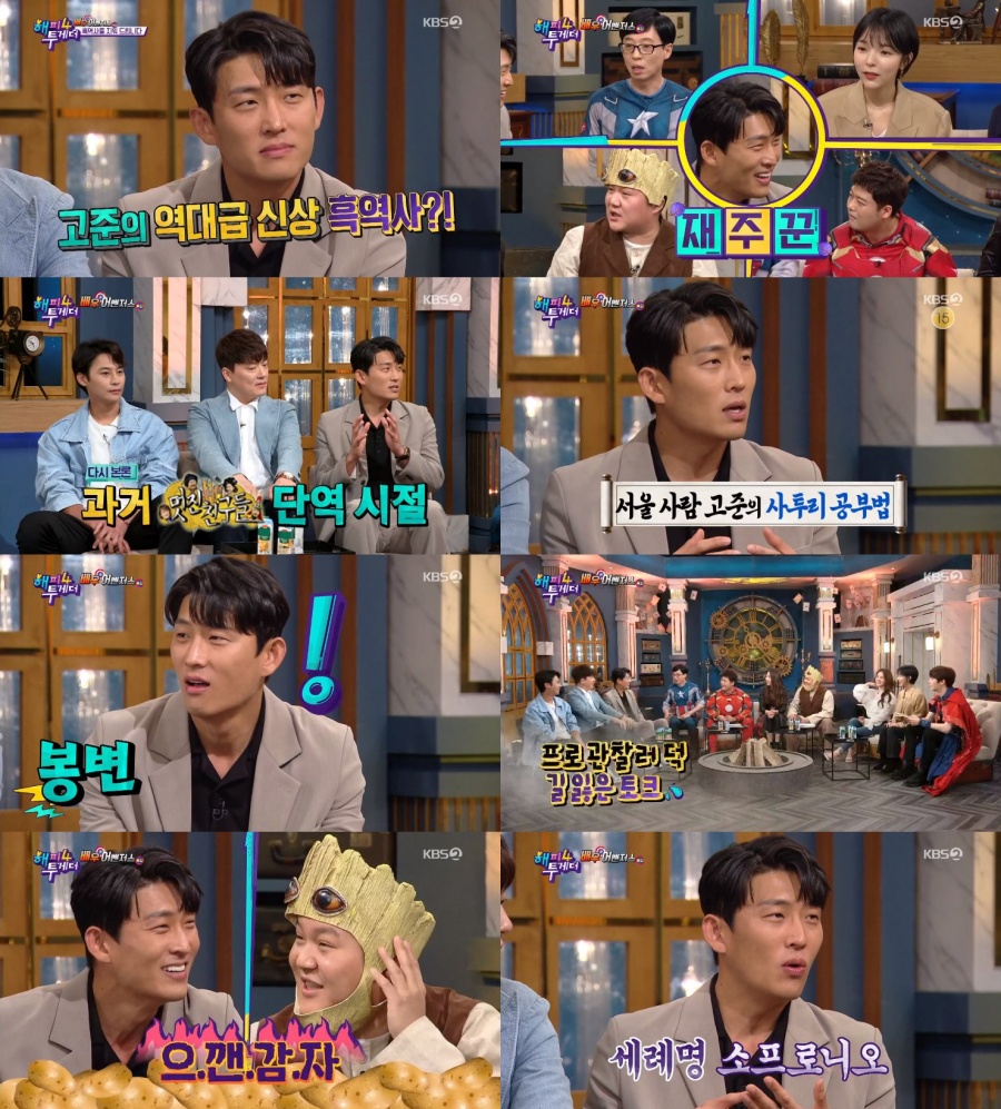 2일 오후 11시 10분에 방송된 KBS2 ‘해피투게더 4’의 ‘배우 어벤져스 특집’에서 고준이 재치 있는 입담과 솔직한 리액션으로 목요일 밤을 ‘순삭’시켰다.