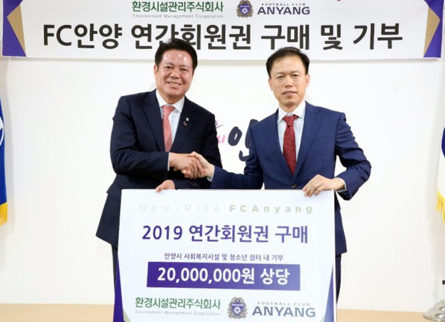 [스포티비뉴스=박주성 기자] 환경시설관리주식회사가 FC안양(구단주 최대호 안양시장)의 2019 연간회원권을 2천만원 상당 구매했다.