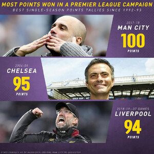 리버풀은 현재 승점 94점으로 잉글랜드 프리미어리그 역사상 승점 3위(1위 2017-18시즌 맨시티 100점 우승, 2004-05시즌 첼시 95점 우승)에 올라있는데도, 1패만 기록했는데도 우승하지 못할 가능성이 생긴 셈이다.