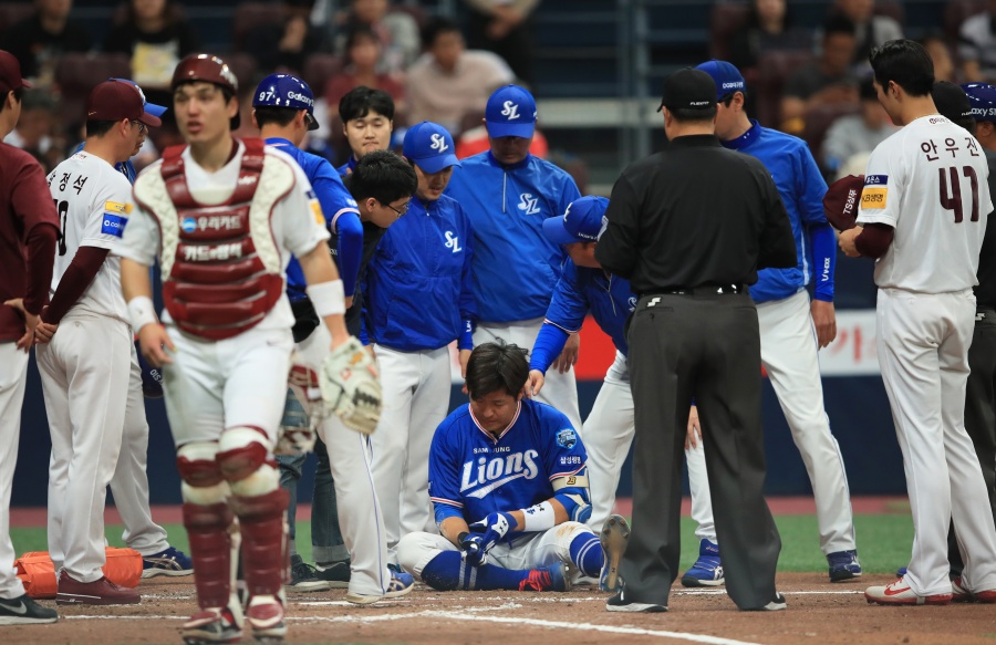 삼성 주전 포수 강민호는 전날(4일) 경기에서 키움 안우진이 던진 공에 목덜미를 맞고 이날 선발 라인업에서 제외됐다.