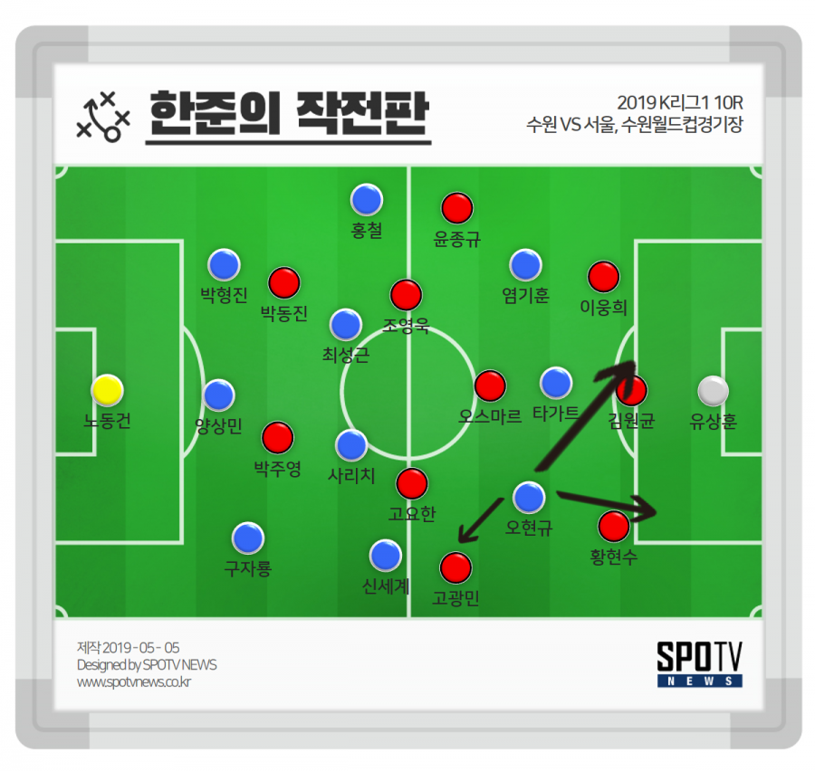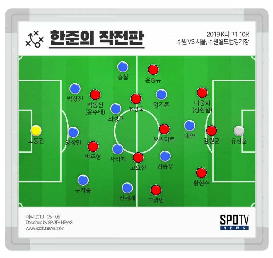 서울의 박주영의 킥, 고요한의 돌파를 통한 역습과 세트피스 공격이 예리했다. 수원이 공격 기회를 확실한 슈팅으로 이어가지 못하며 서울 쪽으로 흐름이 넘어갔다. 이임생 감독은 그 타이밍을 내주지 않고자 전반 40분에 오현규를 불러들이고 데얀을 조기 투입했다. 이임생 감독이 경기 후에 말하겠다던 복안은, 데얀이 주전 경쟁에 밀린 것이 아니라 적절한 타이밍이 해결사 투입을 준비하고 있다는 것이었다.