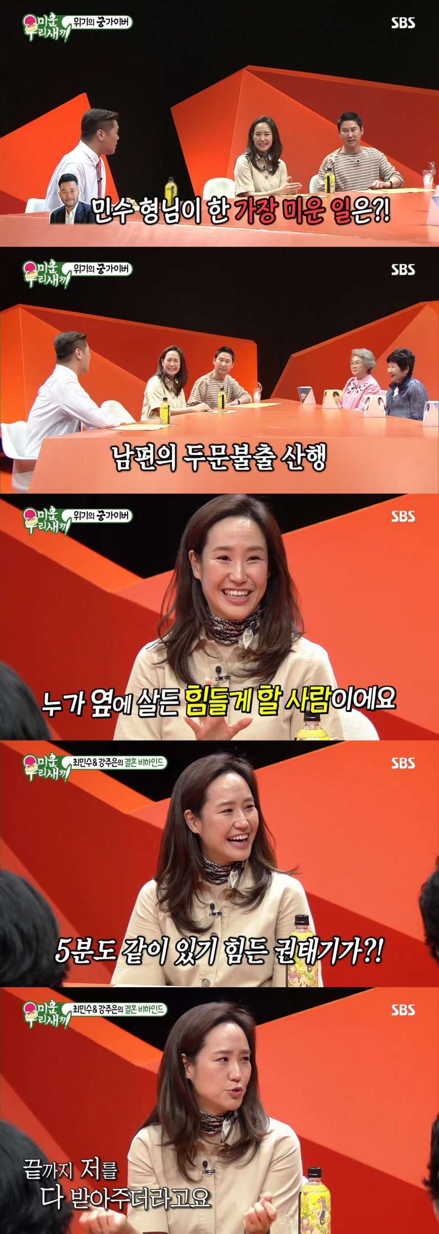 이날은 스페셜 MC로 강주은이 출연해 ‘미운 남편’ 공감대로 '모벤져스'의 큰 호응을 받았다. 강주은은 “최민수가 가장 미웠던 일은?” 이라는 MC 질문에 “돌발 산행”을 꼽았다. 가족을 힘들지 않게 하기 위해 산으로 갔지만 정작 주은은 그 당시 남편이 미웠다며 “누가 옆에 살든 힘들게 할 사람이에요”라고 돌직구 발언을 해 웃음을 안겼다. 그러나 권태기 경험을 털어놓으며 “내가 살면서 이만큼 받아줬는데, 어디까지 받아주나” 온갖 반항으로 남편 테스트를 했으나 “끝까지 저를 다 받아주더라구요”라며 최민수의 속 깊은 마음에 고마움을 내비치기도 했다.