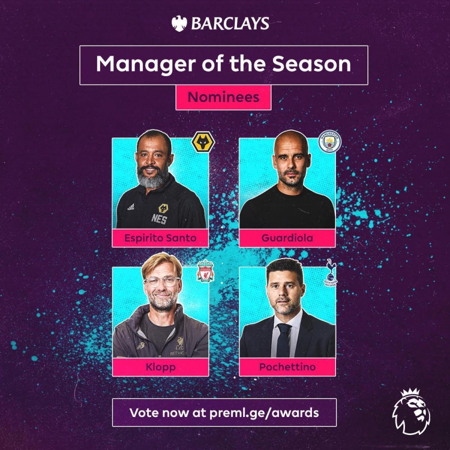 후보는 총 4명으로 맨체스터 시티의 주제프 과르디올라, 리버풀의 위르겐 클롭, 토트넘의 마우리시오 포체티노, 울버햄튼의 누누 산투다.