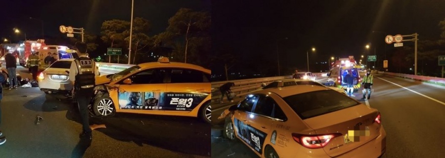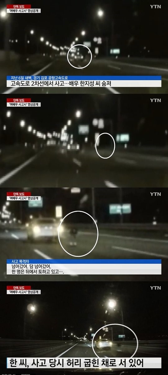 해당 사고가 담긴 블랙박스 영상에는 한지성 부부의 차량이 2차선 도로에 비상등을 켠 채 정차하고 있다. 이후 차에서 동시에 내린 이들 부부. 한지성의 남편은 화면 오른쪽 가드레일로, 한지성은 차 뒤에서 허리를 굽히고 있다. 이 영상에는 제보한 목격자들이 “넘어갔어. 담 넘어갔어” “한명은 뒤에서 토하고 있고” “택시가 들이받았어. 사람 있었는데 저 뒤에”라고 당시 상황을 설명하는 목소리도 담겨있다.