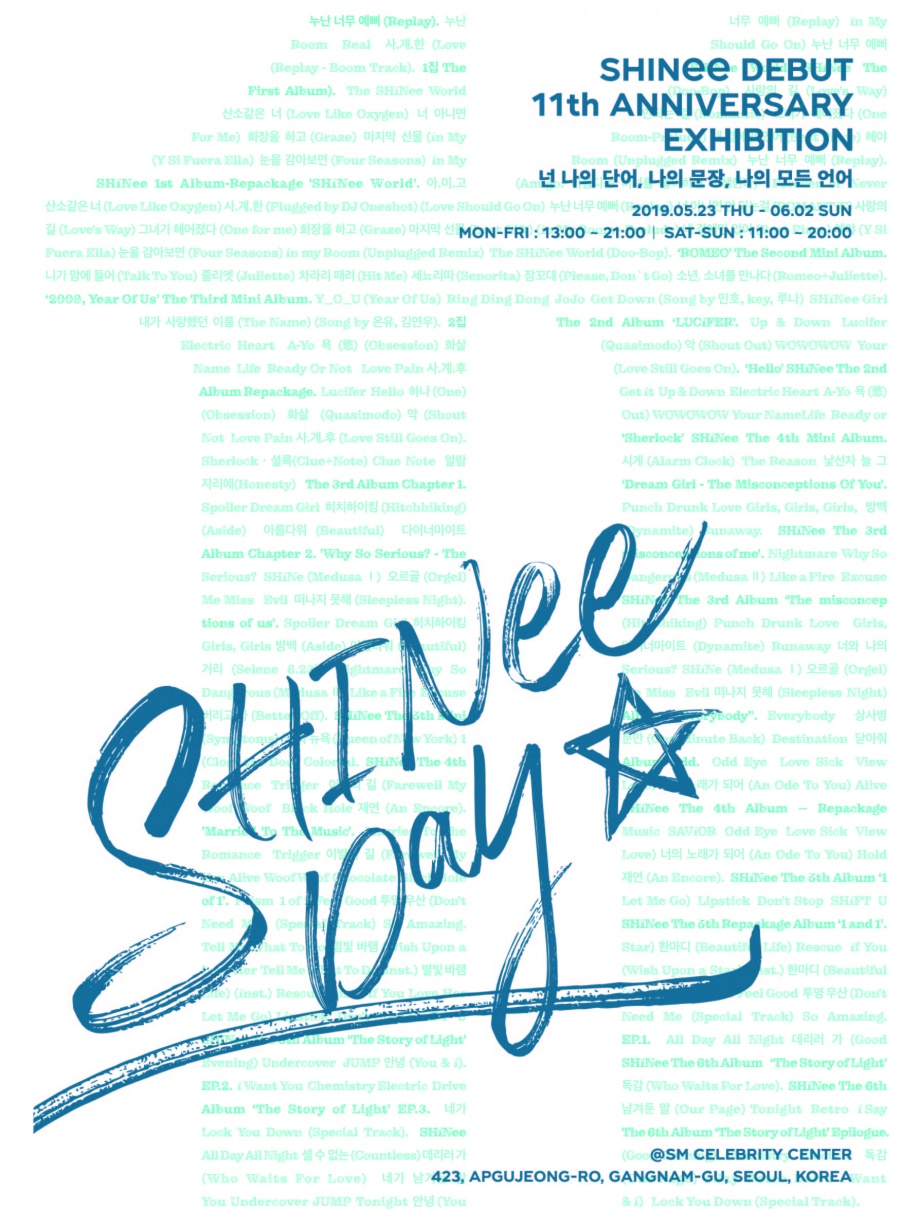 샤이니 데뷔 11주년 기념 전시회 ‘샤이니 데이 - 넌 나의 단어, 나의 문장, 나의 모든 언어’는 23일부터 6월 2일까지 11일간 서울 압구정동 SM엔터테인먼트 셀러브리티 센터에서 열리며, 앨범 테마를 담은 포토존, 미니 뮤직비디오 세트, 콘서트 의상 전시 등 총 11개의 섹션으로 구성되어 있어, 샤이니의 다채로운 매력을 만나기에 충분하다.