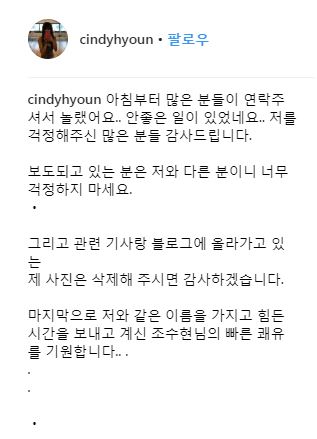 아침부터 많은 연락을 받았다는 조수현은 "안 좋은 일이 있었다. 저를 걱정해주신 많은 분들 감사드린다. 보도되고 있는 분은 저와 다른 분이니 너무 걱정하지 말라"며 "관련 기사와 블로그에 올라가고 있는 제 사진은 삭제해 주시면 감사하겠다"고 말했다.