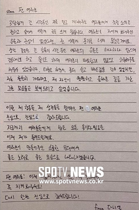 강다니엘은 10일 자신의 SNS에 "3달 넘게 긴 시간 동안 저를 믿고 기다려주신 여러분에게 직접 소식을 전하고 싶어서 이렇게 글을 쓰게 됐다"고 자필 편지를 게재했다.