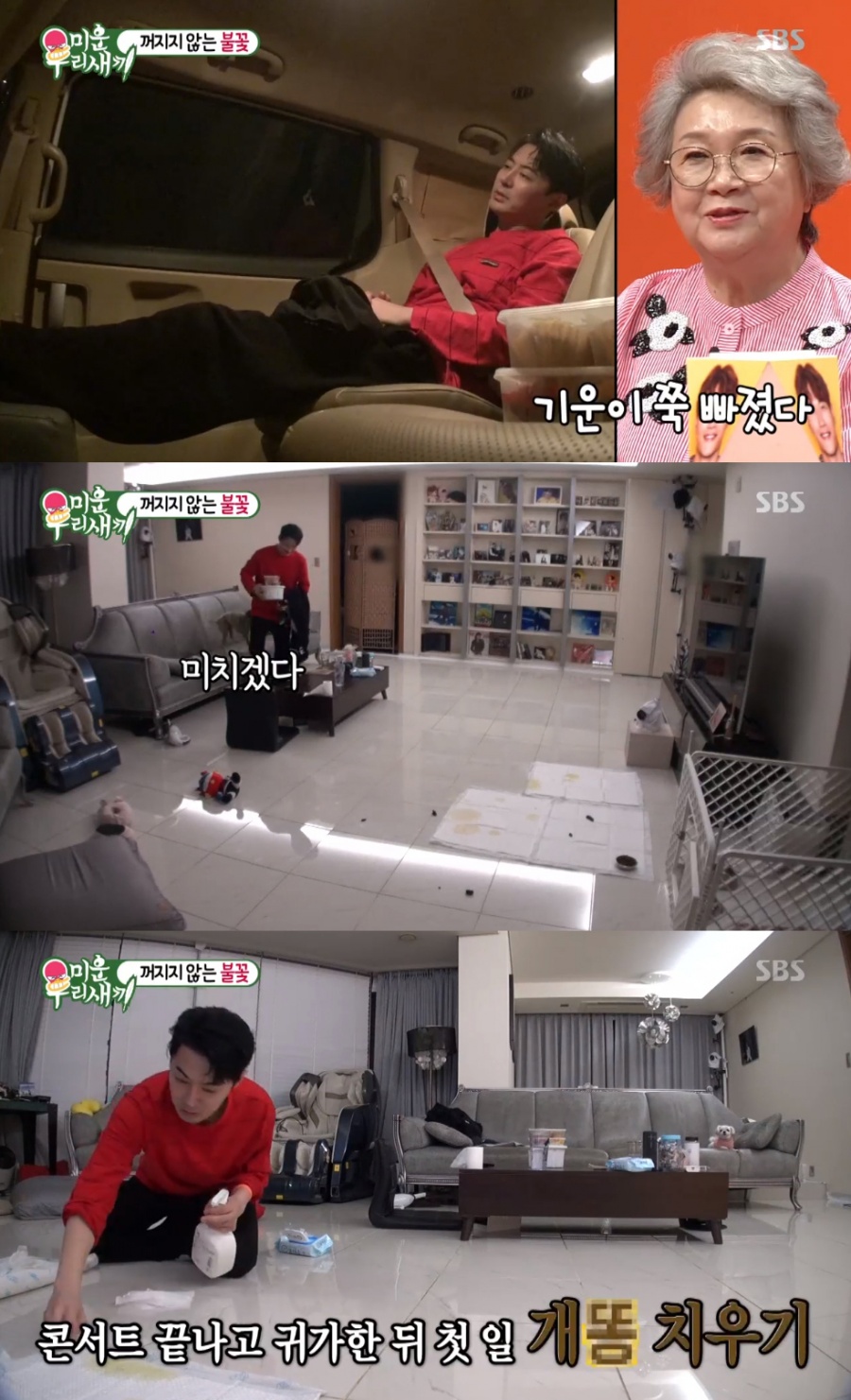 화려한 콘서트 뒤 현실적인 '개 아빠' 전진은 애완견들과 따뜻한 시간을 보내는 한편 식은 도시락으로 끼니를 떼워 미우새 엄마들의 안쓰러운 시선을 받았다.