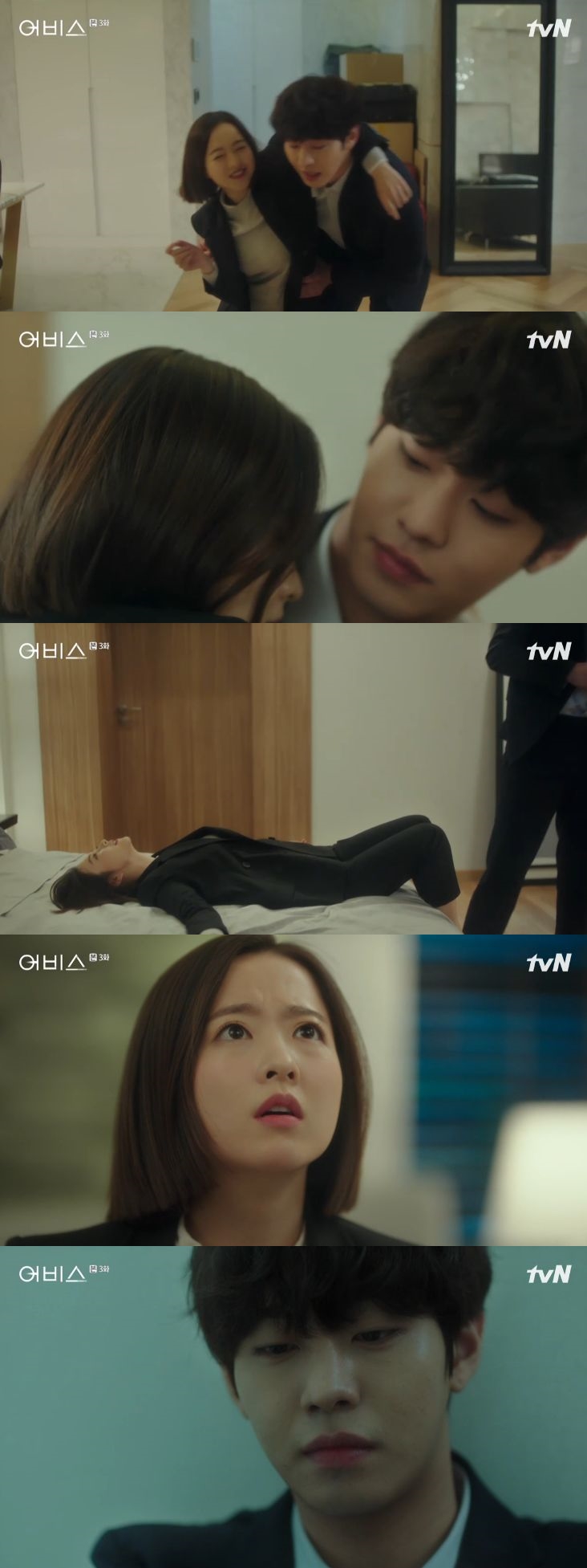 13일 방송된 tvN 월화드라마 ‘어비스:영혼 소생 구슬’(이하, ‘어비스’ 연출 유제원, 극본 문수연)에서는 고세연(박보영)이 차민(안효섭)에게 찰싹 달라붙어 유혹하는 모습이 그려졌다.