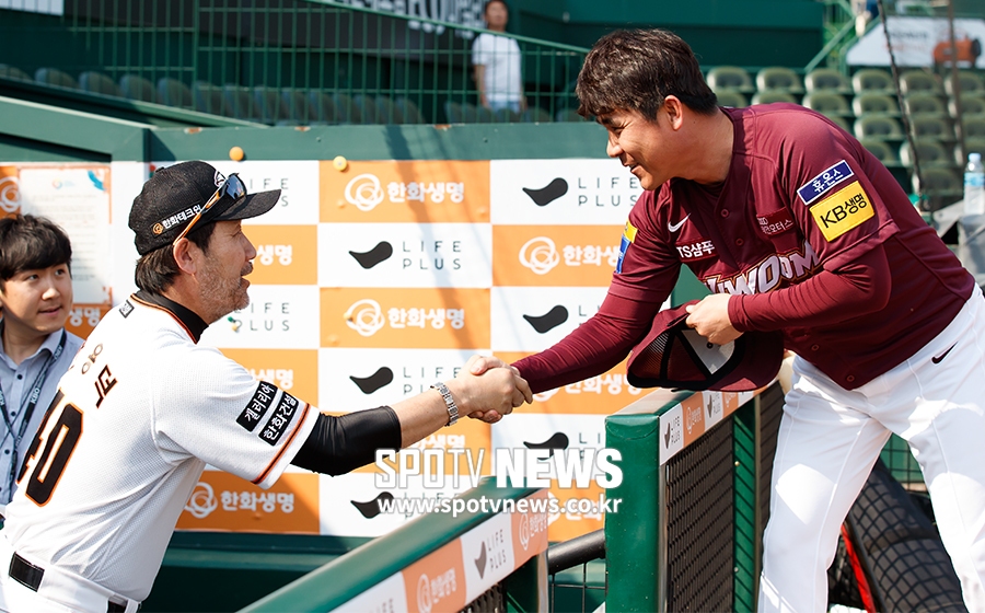 [스포티비뉴스=대전, 한희재 기자] 한화 이글스와 키움 히어로즈의 2019 KBO리그 경기가 14일 오후 대전 한화생명이글스파크에서 열린다. 키움 장정석 감독이 한화 더그아웃으로 찾아와 한용덕 감독과 악수를 하고 있다.