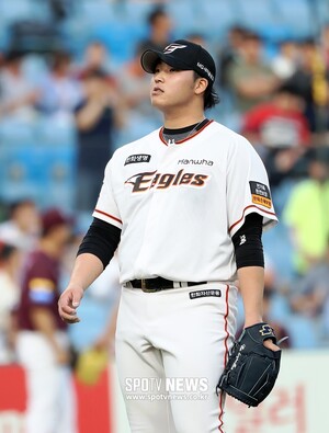 [스포티비뉴스=대전, 한희재 기자] 한화 이글스와 키움 히어로즈의 2019 KBO리그 경기가 14일 오후 대전 한화생명이글스파크에서 열렸다. 1회초 2사 1루, 키움 박병호에게 볼넷을 허용한 한화 선발투수 김민우가 아쉬워하고 있다.