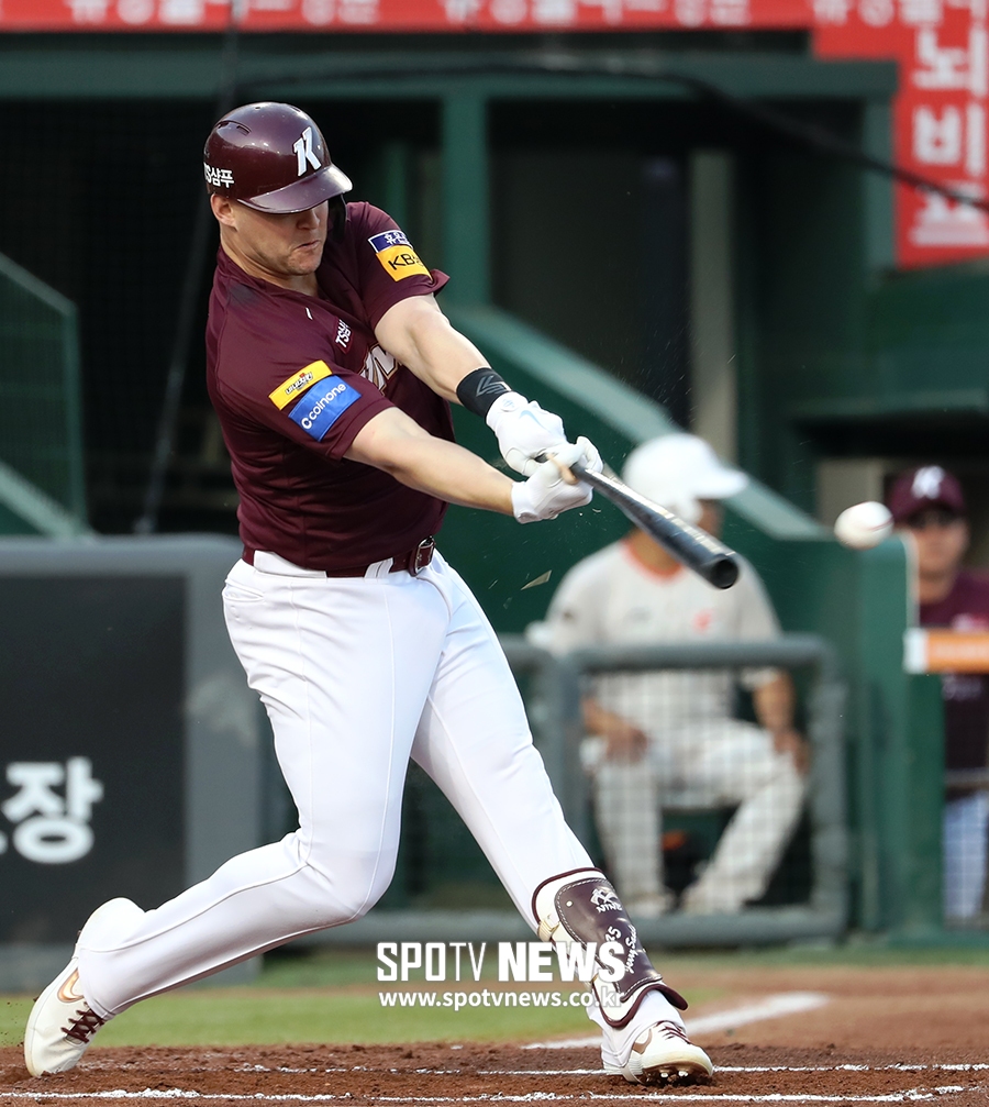 [스포티비뉴스=대전, 한희재 기자] 한화 이글스와 키움 히어로즈의 2019 KBO리그 경기가 14일 오후 대전 한화생명이글스파크에서 열렸다. 1회말 2사 1, 2루, 키움 샌즈가 1타점 적시타를 치고 있다.
