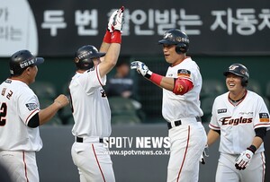 [스포티비뉴스=대전, 한희재 기자] 한화 이글스와 키움 히어로즈의 2019 KBO리그 경기가 14일 오후 대전 한화생명이글스파크에서 열렸다. 1회말 2사 만루, 한화 최진행이 키움 선발투수 이승호를 상대로 만루홈런을 친 후 득점주자 호잉과 하이파이브를 하고 있다.