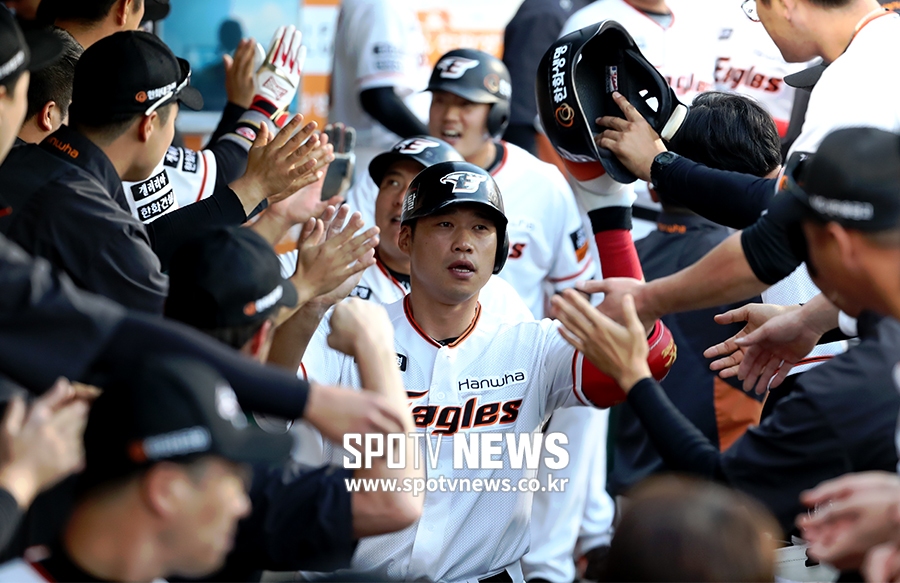 [스포티비뉴스=대전, 한희재 기자] 한화 이글스와 키움 히어로즈의 2019 KBO리그 경기가 14일 오후 대전 한화생명이글스파크에서 열렸다. 1회말 2사 만루, 한화 최진행이 키움 선발투수 이승호를 상대로 만루홈런을 친 후 더그아웃의 동료들과 하이파이브를 하고 있다.