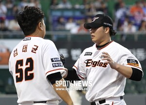 [스포티비뉴스=대전, 한희재 기자] 한화 이글스와 키움 히어로즈의 2019 KBO리그 경기가 14일 오후 대전 한화생명이글스파크에서 열렸다. 3회초 2사 3루, 키움 샌즈를 삼진으로 잡아낸 한화 선발투수 김민우가 김태균의 환영을 받고 있다.