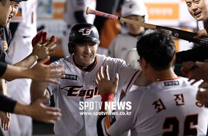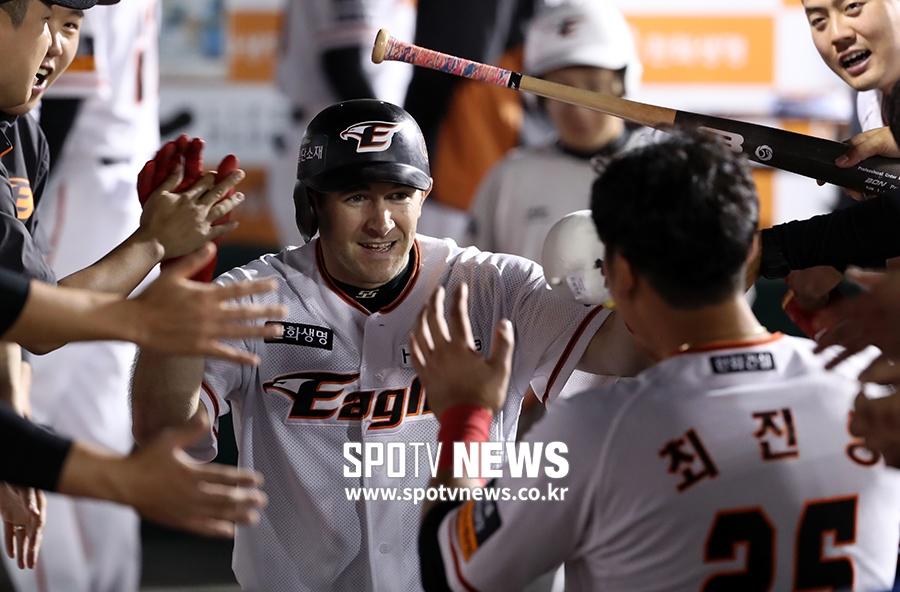 [스포티비뉴스=대전, 한희재 기자] 한화 이글스와 키움 히어로즈의 2019 KBO리그 경기가 14일 오후 대전 한화생명이글스파크에서 열렸다. 5회말 2사, 키움 선발투수 이승호를 상대로 솔로포를 친 한화 호잉이 동료들의 축하를 받고 있다.