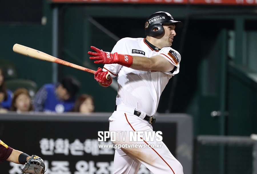 [스포티비뉴스=대전, 한희재 기자] 한화 이글스와 키움 히어로즈의 2019 KBO리그 경기가 14일 오후 대전 한화생명이글스파크에서 열렸다. 5회말 2사, 한화 호잉이 키움 선발투수 이승호를 상대로 솔로포를 치고 있다.