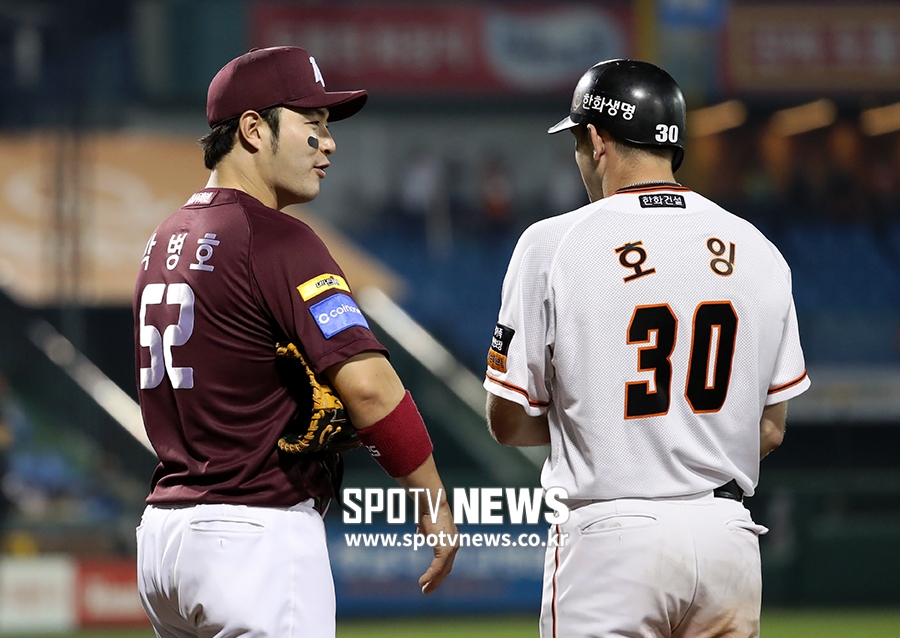 [스포티비뉴스=대전, 한희재 기자] 한화 이글스와 키움 히어로즈의 2019 KBO리그 경기가 14일 오후 대전 한화생명이글스파크에서 열렸다. 7회말 2사, 키움 좌익수 이정후가 한화 호잉의 타구를 몸을 날려 잡았으나 그라운드에 맞고 포구됐다는 판정이 내려졌다. 비디오 판독을 기다리며 이야기 하는 키움 1루수 박병호와 호잉.