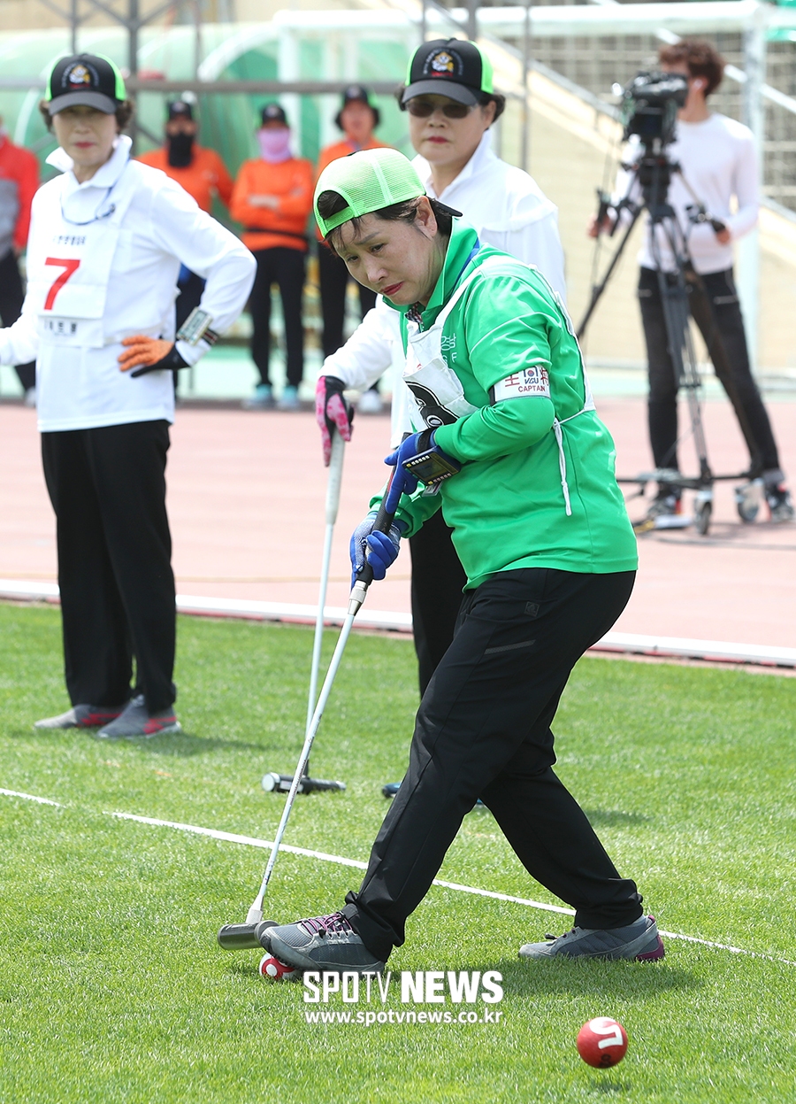 [스포티비뉴스=철원, 곽혜미 기자] 제 17회 대통령기 생활체육 전국게이트볼대회가 15일 오후 강원도 철원종합운동장에서 열렸다. 참가자가 타격을 하고 있다. 스포티비뉴스=철원, 곽혜미 기자