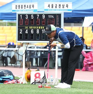[스포티비뉴스=철원, 곽혜미 기자] 제 17회 대통령기 생활체육 전국게이트볼대회가 15일 오후 강원도 철원종합운동장에서 열렸다. 참가자가 타격 준비를 하고 있다. 스포티비뉴스=철원, 곽혜미 기자